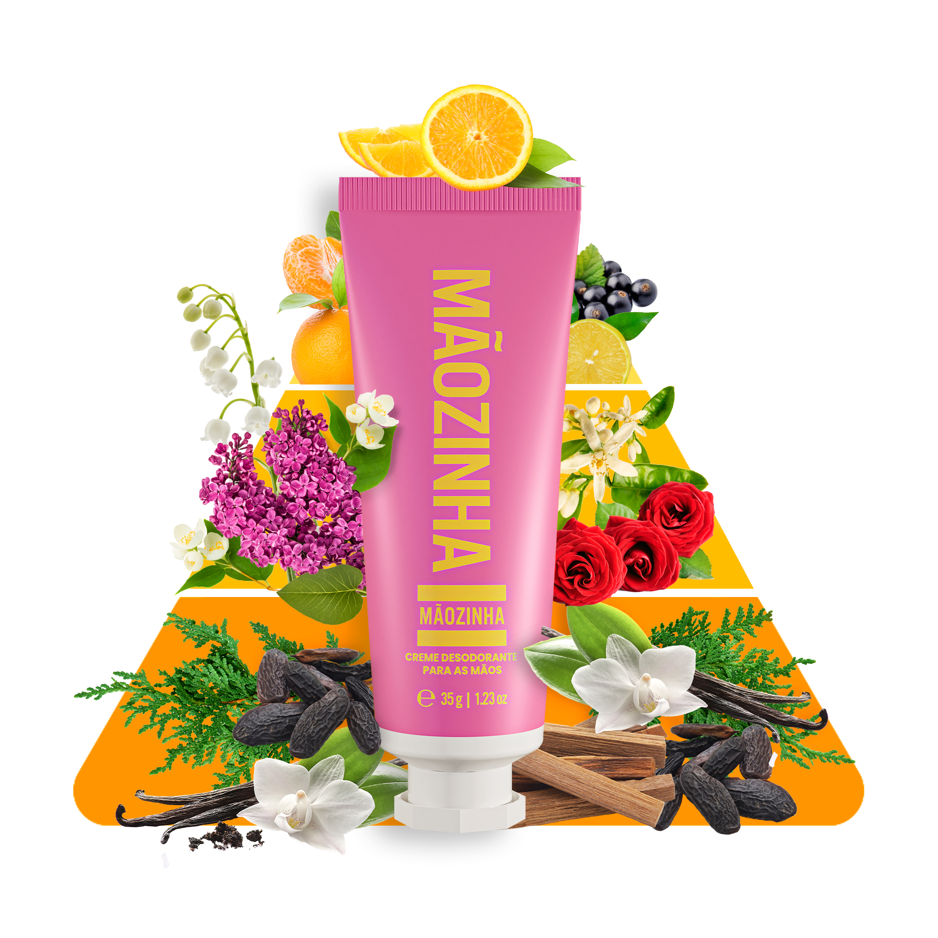 A fragrância floral frutal do Mãozinha combina perfeitamente a vivacidade das frutas cítricas com a sensualidade das flores, resultando em uma experiência olfativa única e envolvente. Essa fragrância oferece o frescor irresistível das frutas cítricas, a delicadeza das flores e a cremosidade adocicada das notas de fundo, criando uma assinatura olfativa que traz bem-estar e prazer a cada aplicação ao longo do dia.